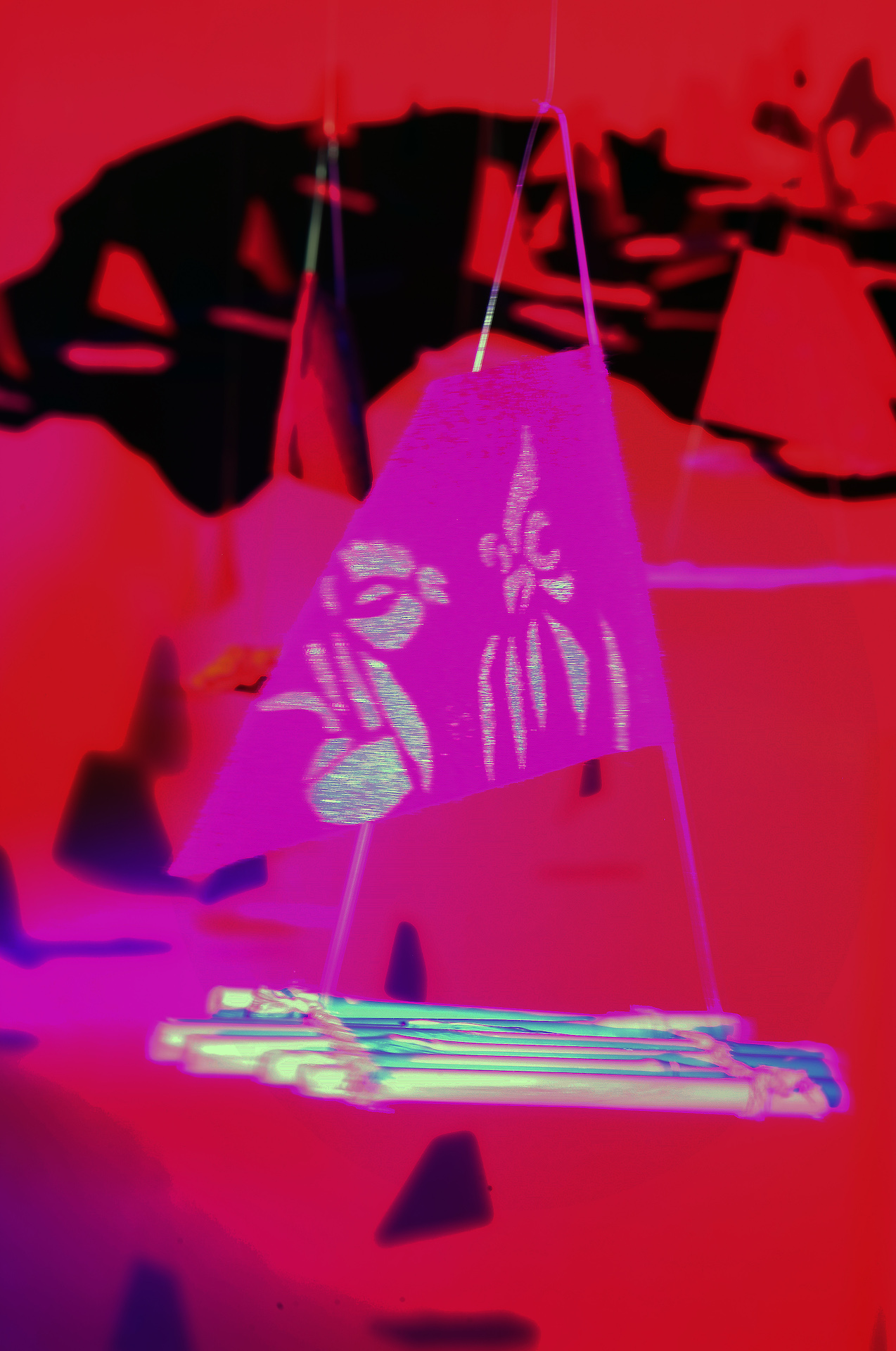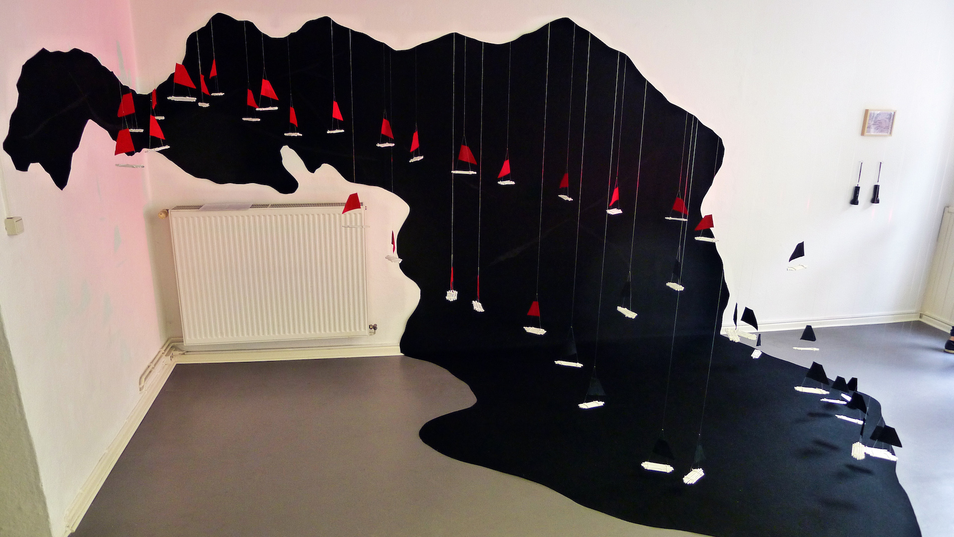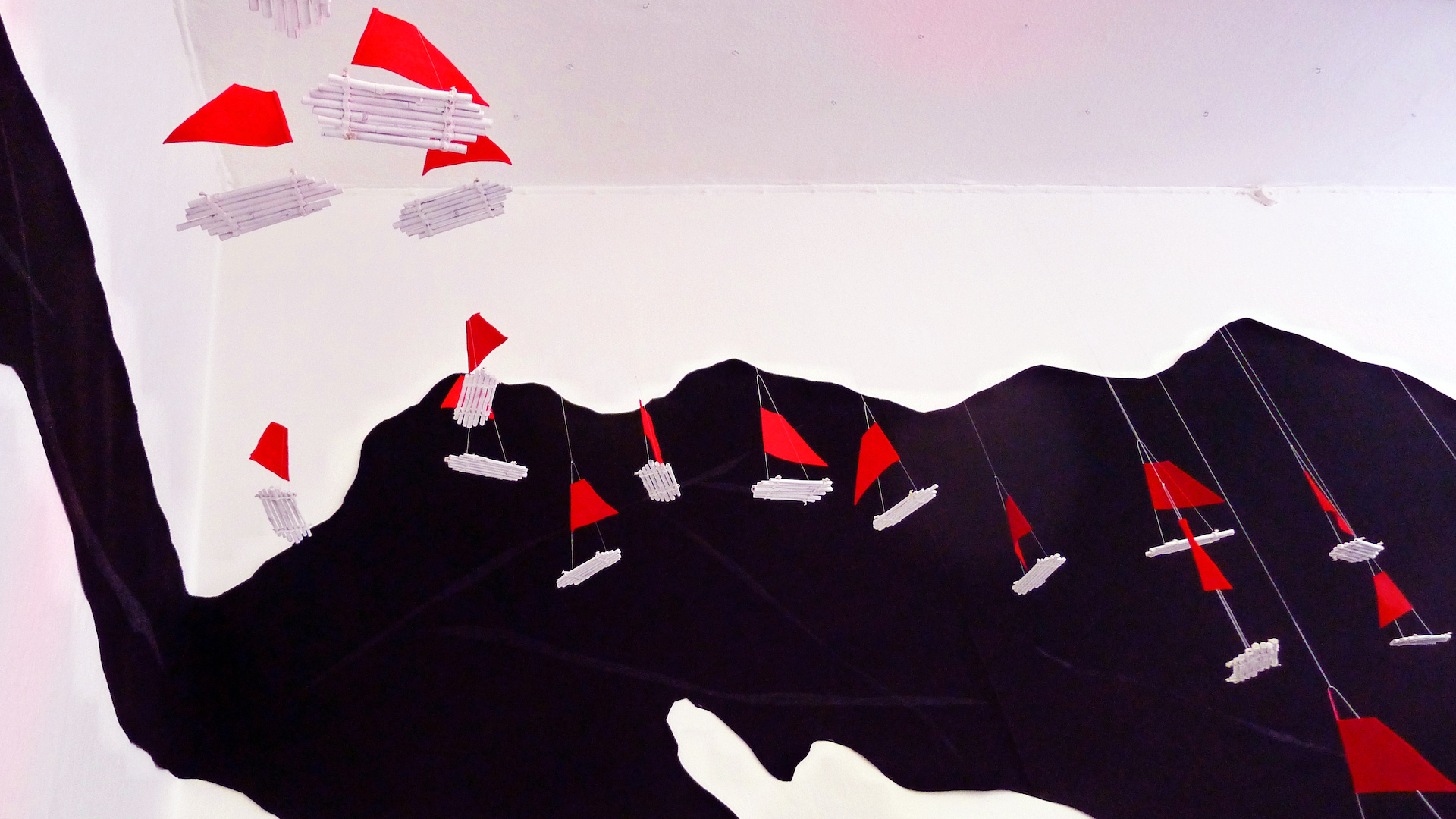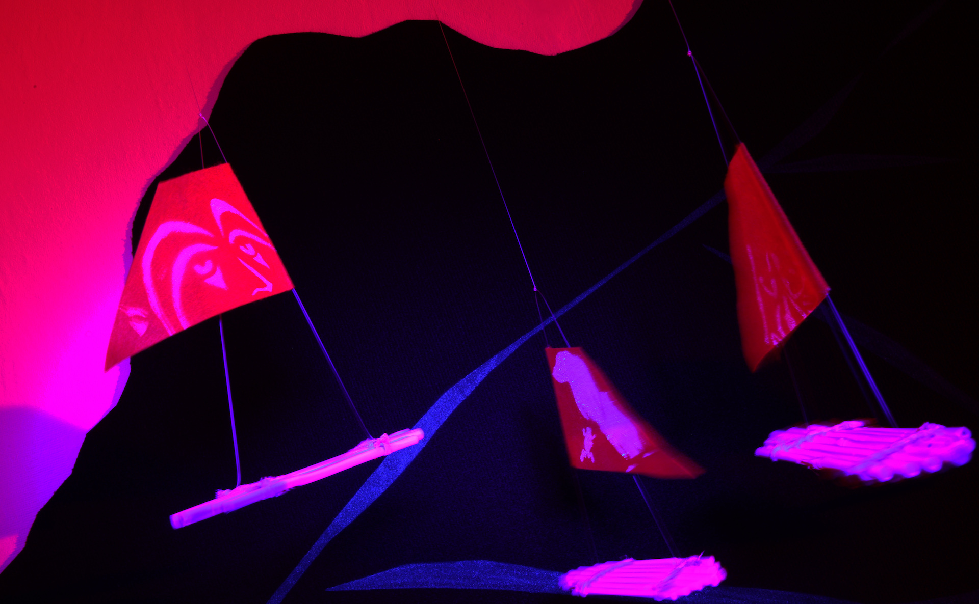 Die Installation beschäftigt sich mit der Ausbreitung der austronesischen Sprachfamilie, die von Taiwan ihren Ausgang nahm und sich über die Inselwelt des gesamten Südpazifiks, Südostasiens und bis hin nach Madagaskar verbreitete: der Südwind (lat. „auster“) hat vor Jahrtausenden mutige Seelen hinaus aufs Meer getrieben und eine unsichtbare Spur der Kommunikation über die Ozeane hinweg hinterlassen…